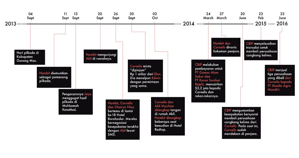 Dari penyelidikan kami berdasarkan wawancara dengan sumber-sumber yang dekat dengan mereka yang terlibat dalam kesepakatan, penuntut KPK, catatan pengadilan, dan dokumen perusahaan, diketahui, penyuapan Akil Mochtar bukanlah titik nadir penyelewengan demokrasi di Gunung Mas. Ia hanyalah secuil gejala dari sistem yang telah berkembang dengan menyerahkan sumber alam kepada perusahaan swasta dan duit-duit haram buat pilkada korup.