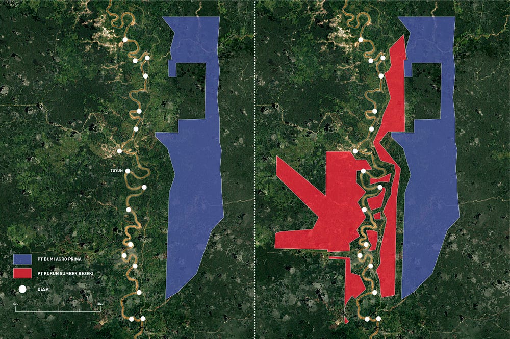 Di Tuyun, konsesi pertama berjarak lima kilometer dari wilayah desa, konsesi kedua justru menelan habis semua lahan sawah dan desa mereka. Secara keseluruhan, enam izin baru yang keluar 19 bulan terakhir masa jabatan Hambit mengancam puluhan desa di sepanjang Sungai Kahayan dan anak sungainya, Rungan. Jika kawasan itu benar-benar terbangun, yang tersisa bagi ribuan masyarakat hanyalah lahan seluas beberapa ratus meter terletak di antara rumah mereka dan areal perkebunan.