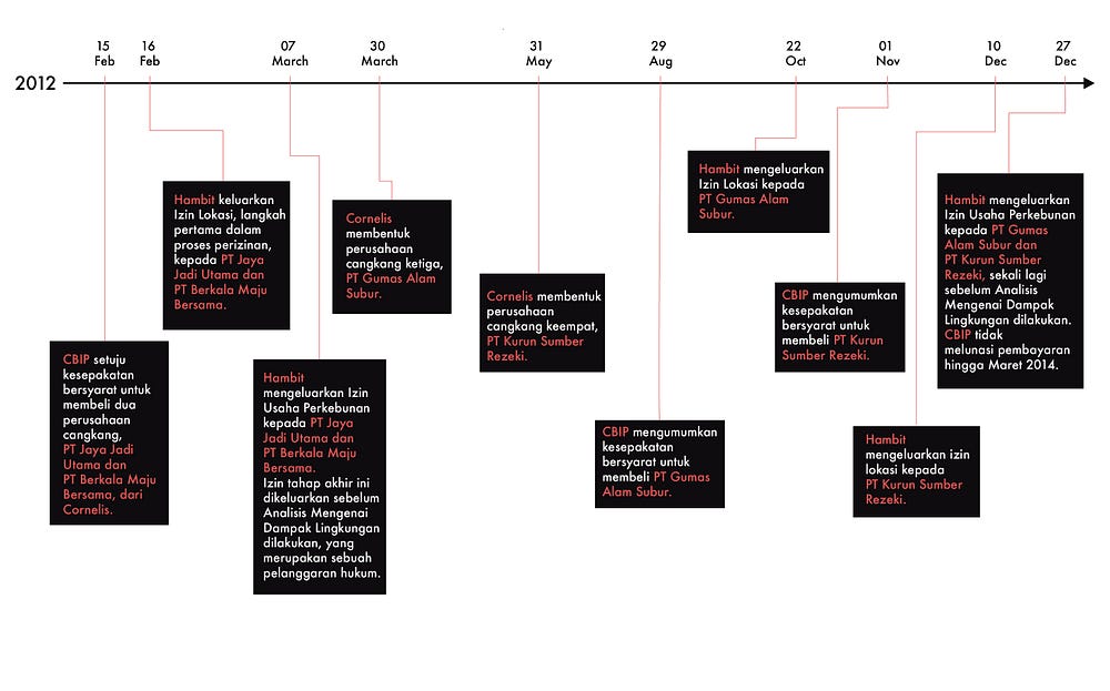 Awal tahun 2012, semua tampak berjalan baik. Cornelis dan kelompoknya sudah mendirikan perusahaan cangkang, sementara Hambit siap mengeluarkan izin dan CBIP siap membeli. Pembagian peran kelompok ini terumus jelas. Elan menangani urusan administratif, Edwin mengawasi logistik pembukaan lahan hutan dan Cornelis mengelola hubungan dengan Hambit selaku tameng politiknya.