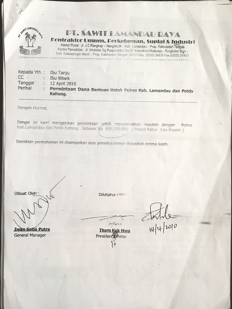 Darius mendapatkan dokumen dari sumber rahasia di perusahaan yang memberikan informasi, Iwan Setia Putra, manajer umum anak usaha CBIP, berusaha menyuap polisi agar menghentikan penyelidikan. Dokumen-dokumen ini, sebagaimana telah kami lihat, berisi memo internal dari manajer yang meminta Rp400 juta untuk “menyelesaikan masalah dengan polisi.” Dari dokumen bank diketahui, uang itu ditransfer kepadanya. Dua pekan kemudian, polisi pun menutup rapat-rapat penyelidikan ini. Iwan tak mau menjawab pertanyaan-pertanyaan kami terkait pembayaran ini. Begitu juga CBIP, tak mau merespon upaya konfirmasi, melalui beberapa kali permintaan wawancara dan menolak menjawab pertanyaan-pertanyaan yang diajukan.
